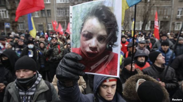 Những người biểu tình chống chính phủ ở Kyiv giờ đây trương hình ảnh của gương mặt sưng tấy của bà như một biểu tượng của sự đàn áp của chính phủ.