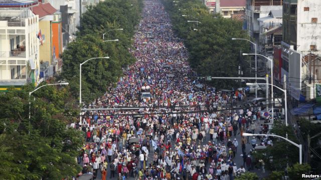 Trước khi dẫn đầu một cuộc tuần hành khổng lồ qua các đường phố ở Phnom Penh, thủ lãnh phe đối lập Sam Rainsy nói với đám đông ở Công viên Tự do tại trung tâm thành phố rằng đây là một ngày lịch sử và ý chí của nhân dân Campuchia sẽ thắng thế.