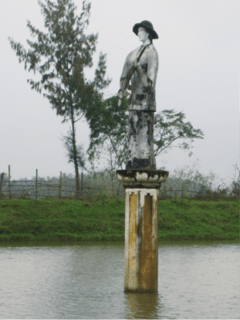Trong hồ nước, nông dân làm chuồng nuôi vịt. Qua mấy ngày mưa lũ, đàn vịt không còn, chỉ còn lại cái chuồng xiêu vẹo tả tơi. Một bác nông dân vác cuốc đi ngang dừng lại góp chuyện: “Mấy tháng trước, hồ nước sạch sẽ lắm, không ai dám thả vịt, thả cá, nước trong vắt. Nhưng từ khi thay Phật bà bằng cô du kích thì ra như ri đây”. Phật Quan Âm? Tôi ngạc nhiên và nhìn kỹ thì thấy có điều lạ là cô du kích này đứng trên… tòa sen.
