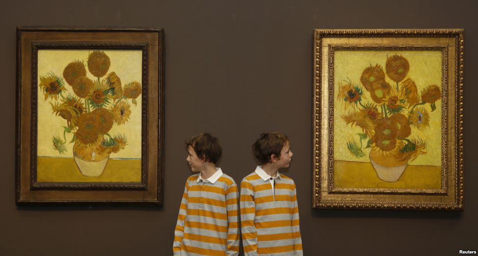 Một cặp song sinh đứng giữa hai bức tranh Hoa hướng dương Vincent van Gogh vẽ năm 1888 (trái) và năm 1889 (phải) tại Bảo tàng triển lãm tranh Quốc gia ở London. Hai bức tranh đã được đoàn tụ tại London lần đầu tiên sau 65 năm và sẽ được trưng bày trong ba tháng, bắt đầu từ ngày 25 tháng 1.