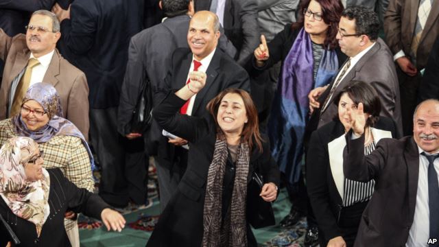Bà Karima Souid (giữa) thành viên trong Quốc hội Lập hiến Tunisia, cùng với mọi người bày tỏ niềm vui sau khi bản hiến pháp mới của Tunisia được thông qua, 26/1/14Bà Karima Souid (giữa) thành viên trong Quốc hội Lập hiến Tunisia, cùng với mọi người bày tỏ niềm vui sau khi bản hiến pháp mới của Tunisia được thông qua, 26/1/14