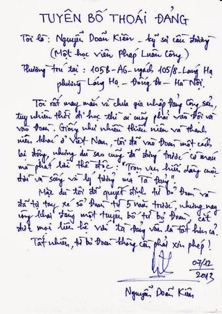 Tôi kêu gọi mọi tổ chức và cá nhân ở trong nước và hải ngoại cùng tập trung năng lực và trí tuệ bước ra lãnh trách nhiệm xây dựng đất nước. Các đồng bào ở hải ngoại có điều kiện hãy trở về nước hoặc hướng năng lực và trí tuệ về quốc nội cùng góp sức giải thể ĐCS và kiến thiết đất nước.
