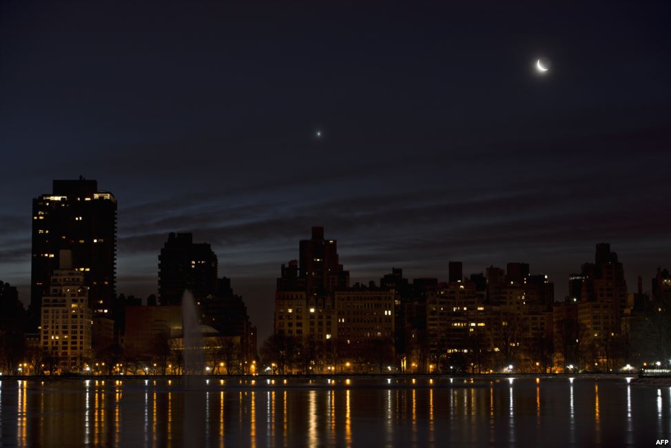 Trăng lưỡi liềm và sao Kim (trái) trên bầu trời vào lúc trước bình minh ở khu vực phía đông quận Manhattan ở New York, Mỹ.