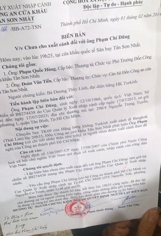 * Cập nhật: Sau khoảng một giờ đồng hồ bị an ninh, hải quan sân bay lập biên bản không cho xuất cảnh, ông Dũng đã ra khỏi phòng làm việc lúc 08h30 phút tối cùng ngày. Dưới đây là biên bản cấm xuất cảnh đối với TS Phạm Chí Dũng: