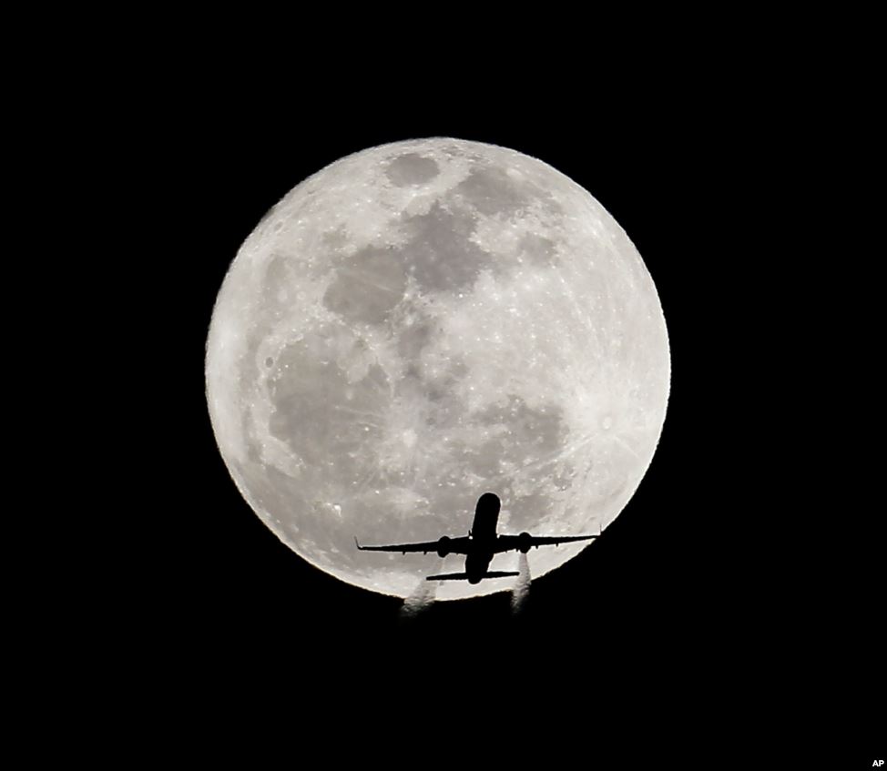 Một chiếc máy bay thương mại bay ngang mặt trăng tại Whittier, California khi tiến gần phi trường Los Angeles, ngày 14 tháng 2,2014.
