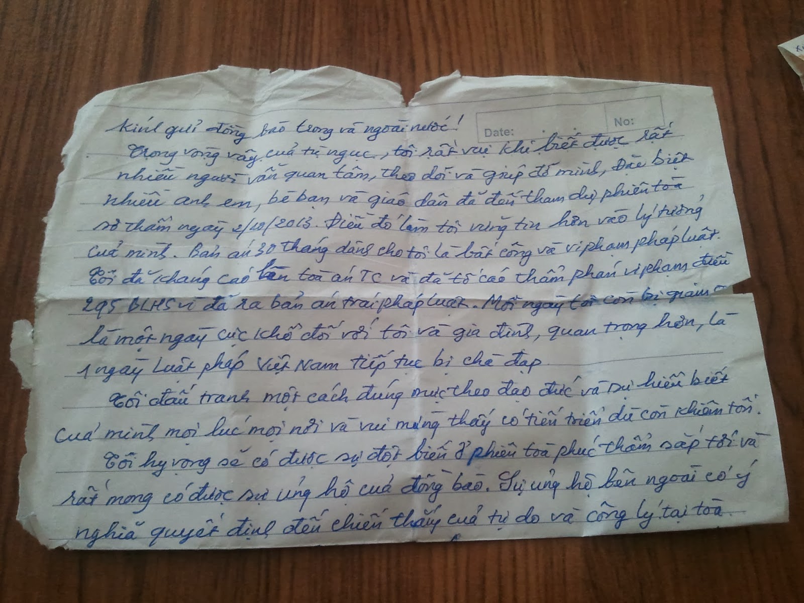 Trong vòng vây của tù ngục, tôi rất vui khi biết được rất nhiều người vẫn quan tâm, theo dõi và giúp đỡ mình. Đặc biệt nhiều anh em bạn bè và giáo dân đã đến tham dự phiên tòa sơ thẩm ngày 2/10/2013. Điều đó làm tôi vững tin hơn vào lý tưởng của mình. Bản án 30 tháng dành cho tôi là bất công và vi phạm pháp luật. Tôi đã kháng cáo lên tòa án tối cao và đã tố cáo thẩm phám vi phạm điều 295 BLHS đã ra bản án trái pháp luật. Mỗi ngày tôi còn bị giam là một ngày cực khổ tối với tôi và gia đình, quan trọng hơn là một ngày luật pháp Việt Nam tiếp tục bị chà đạp.