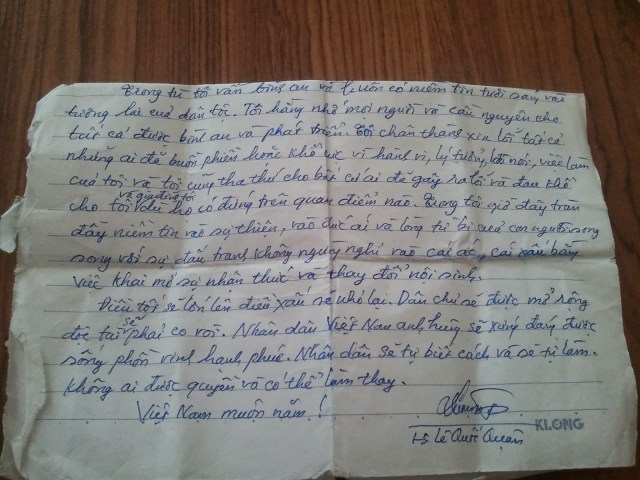 Trong tù tôi vẫn bình an và luôn có niềm tin tươi sáng vào tương lai của dân tộc. Tôi hằng nhớ mọi người và cầu nguyện cho tất cả được bình an và phát triển. Tôi chân thành xin lỗi tất cả những ai đã buồn phiền hoặc khổ cực vì hành vi, lý tưởng, lời nói, việc làm của tôi và tôi cũng tha thứ cho bất cứ ai đã gây ra lỗi và đau khổ cho tôi và gia đình tôi. Dù họ có đứng trên quan điểm nào. Trong tôi giờ đây tràn đầy niềm tin vào sự thiện, vào đức ái và lòng từ bi của con người song song với sự đấu tranh không ngừng nghỉ vào cái ác, cái xấu bằng việc khai mở sự nhận thức và thay đổi nội sinh.
