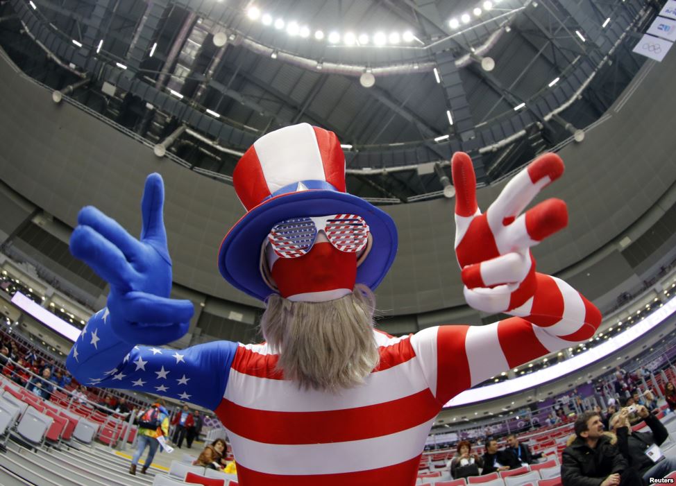 Một người hâm mộ Mỹ trong màu cờ sắc áo quốc gia trước trận đấu khúc côn cầu trên băng của nữ tranh huy chương vàng với Canada tại Thế vận hội mùa đông Sochi 2014, Nga.