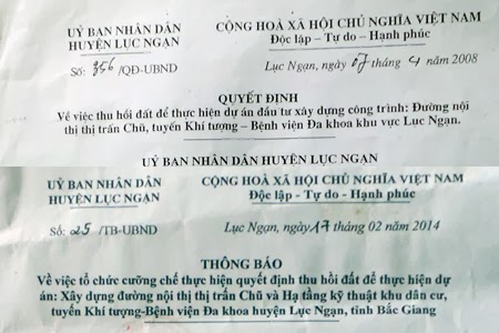 Căn nguyên của những bức xúc trên xuất phát từ những lập lờ trong các Quyết định, Thông báo của chính quyền huyện Lục Ngạn. Theo đó, toàn bộ các Quyết định, Thông báo và các văn bản liên quan của UBND huyện Lục Ngạn từ năm 2007 đến cuối năm 2013 gửi các hộ dân đều ghi rõ, việc thu hồi đất là để “thực hiện dự án đầu tư xây dựng công trình đường nội thị thị trấn Chũ”. Tuy nhiên, đến thông báo ngày 31/12/2013, các thông báo thu hồi đất lại được “bổ sung” thêm mục đích thu hồi đất là để “thực hiện dự án đầu tư xây dựng công trình đường nội thị thị trấn Chũ và Hạ tầng kỹ thuật khu dân cư”.