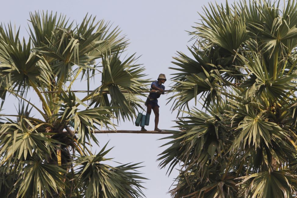 Một người đàn ông Campuchia đi trên một thanh tre dài 5 mét bắc ngang qua 2 cây thốt nốt cao để lấy nước thốt nốt làm đường trong mùa thu hoạch ở làng Samroang, tỉnh Kampong Chhnang, tây bắc của Phnom Penh.
