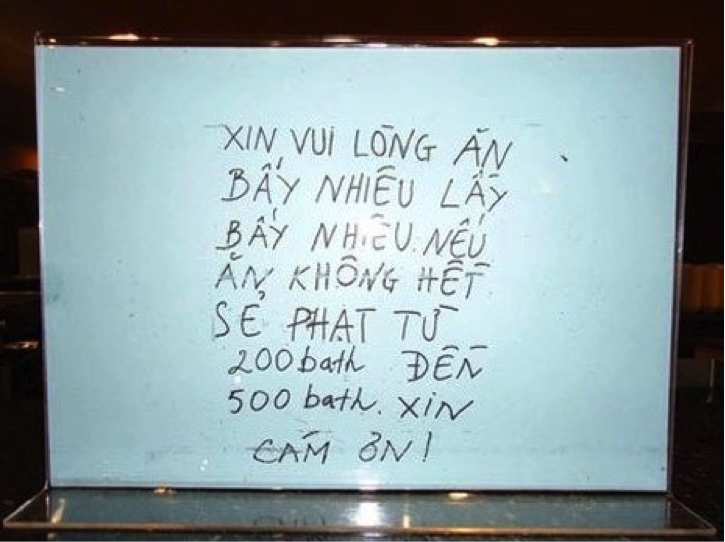 Tấm biển bằng tiếng Việt đặt ở một nhà hàng buffet tại Thái Lan. Ảnh FB.