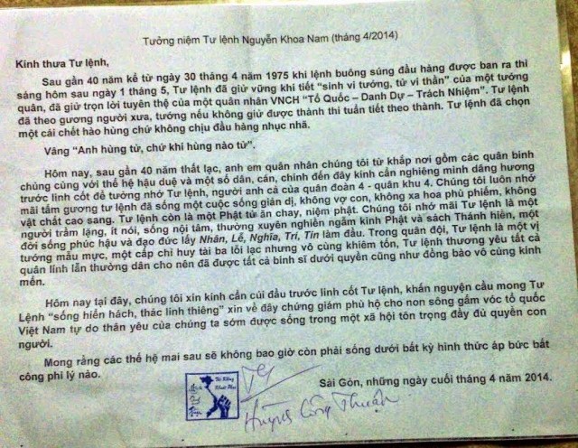 Nhân những ngày cuối tháng 4 năm nay, năm 2014, với sự cố gắng chúng tôi những cựu quân nhân QLVNCH đã thực hiện một buổi lễ tưởng niệm Tư Lệnh Nguyễn Khoa Nam trước di cốt của người tại Sài Gòn trong không khí trang nghiêm và thân tình. Anh em chúng tôi mặc sắc phục đại diện tất cả các binh chủng kể cả binh chủng nữ quân nhân…