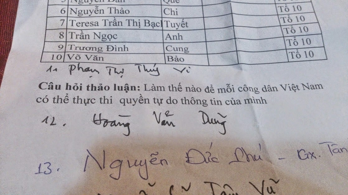 Cuối buổi hội thảo, các tham dự viên bao gồm 10 tổ chia nhau thảo luận với một câu hỏi duy nhất: “Làm thế nào để mỗi công dân Việt Nam có thể thực thi quyền tự do thông tin của mình”