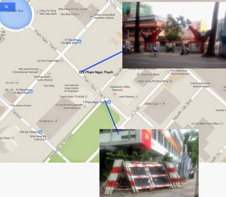 Vào lúc 22h15 tối thứ bảy Sài Gòn, anh Nguyễn Ngọc Già, một cây viết thường xuyên của Danlambao nhắn tin barrier đã được dựng lên ở số 4 Duy Tân, đối diện là Thành đoàn HCM, ngã tư Hai Bà Trưng – Điện Biên Phủ, lãnh sự quán mới lẫn cũ của Trung cộng, Diamond Plaza.