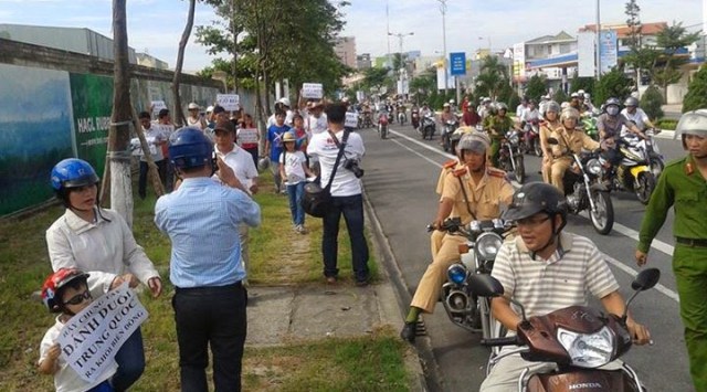 Người dân Đà Nẵng tuần hành phản đối TQ xâm lược trong sự giám sát chặt chẽ của công an (Ảnh: FB Lê Hùng)