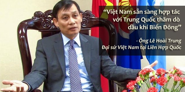 Hoàng Trần (Danlambao) – Hôm 16/7, ngay trong ngày Trung Quốc thông báo di dời giàn khoan 981 ra khỏi Biển Đông, đại sứ Việt Nam tại Liên Hợp Quốc là ông Lê Hoài Trung lập tức đưa ra tuyên bố: “Việt Nam sẵn sàng xem xét những khả năng hợp tác với Trung Quốc trong hoạt động thăm dò dầu mỏ trên Biển Đông”.