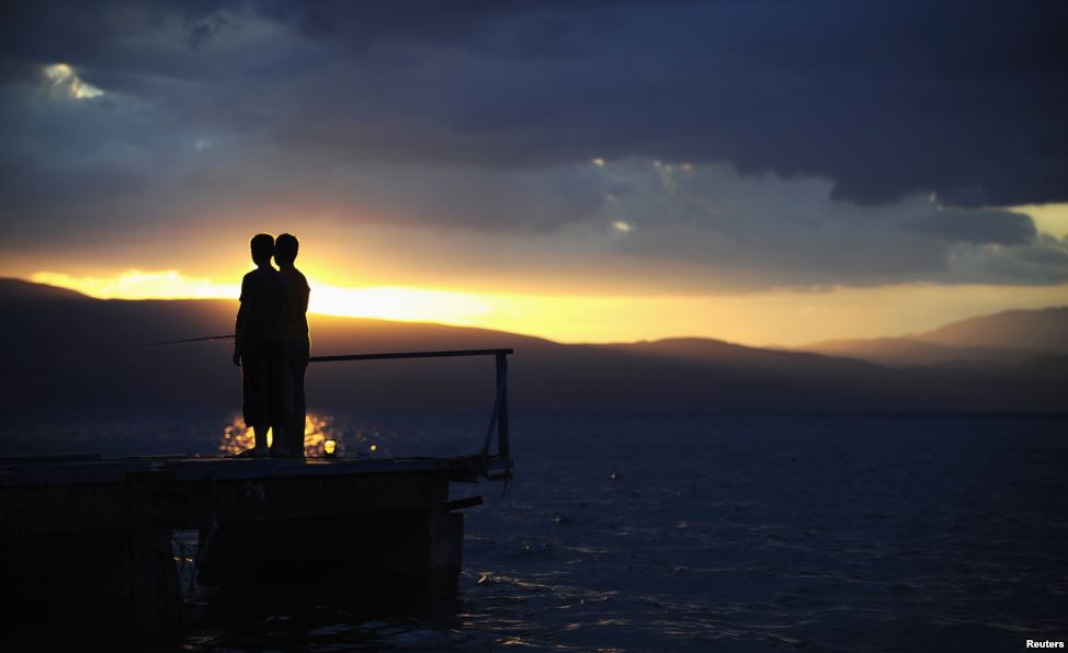Một cậu bé câu cá bên bờ hồ Ohrid ở làng Trpejica, Macedonia, trong một buổi tối có mây bão vần vũ, ngày 16 tháng 7, 2014