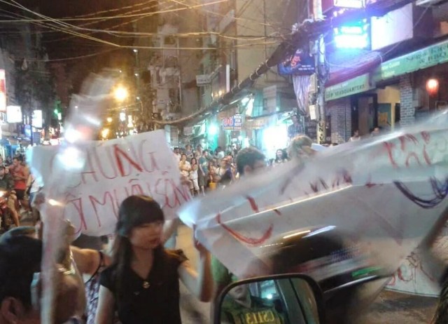 Có mấy chị em nằm lăn ra trước mũi xe của đội TTĐT. Có các anh Tây uống xin xỉn cũng nhào ra biểu tình ké. Rồi lực lượng CSCĐ được điều tới…Náo loạn!