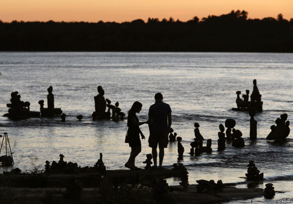 Một cặp vợ chồng ngắm nhìn vào tác phẩm điêu khắc đá tại Ghềnh Remic trên sông Ottawa lúc hoàng hôn, tại Ottawa, Canada, ngày 23 tháng 7, 2014.