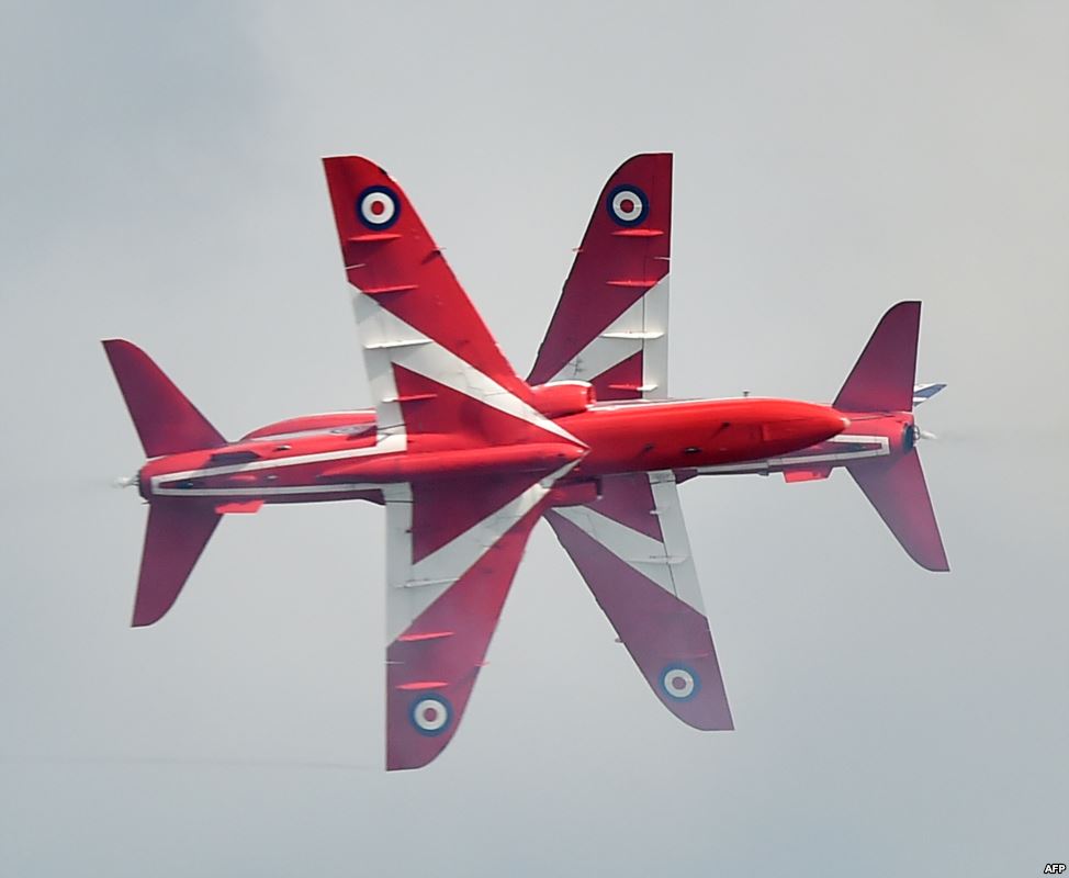 Phi đoàn nhào lộn của Không lực Hoàng gia Anh The Red Arrows biểu diễn tại triển lãm hàng không ‘Airbourne’ ngoài khơi bờ biển ở Eastbourne, miền Nam nước Anh