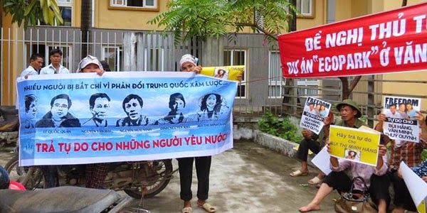 Dân oan giăng biểu ngữ đòi tự do cho những người yêu nước tại Hà Nội