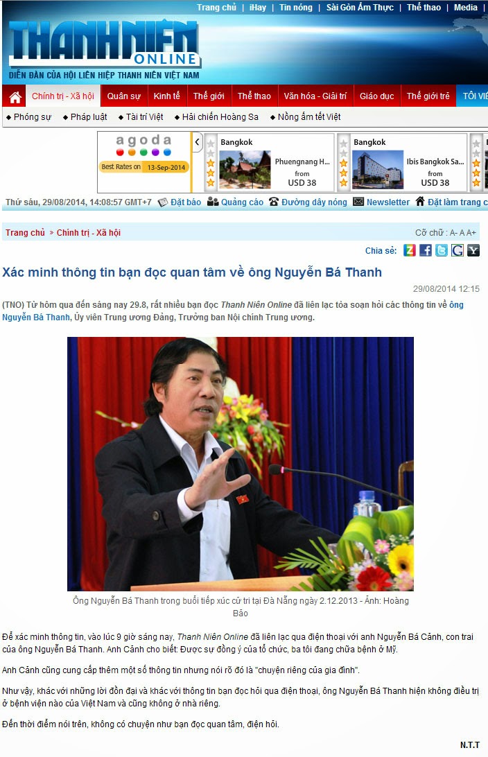 * Cập nhật: Chiều ngày 29/8/2014, báo Người Lao Động Online tiếp tục dẫn lời ông Nguyễn Bá Cảnh nói rằng ông Thanh đã sang Mỹ chữa bệnh được gần 2 tuần qua.