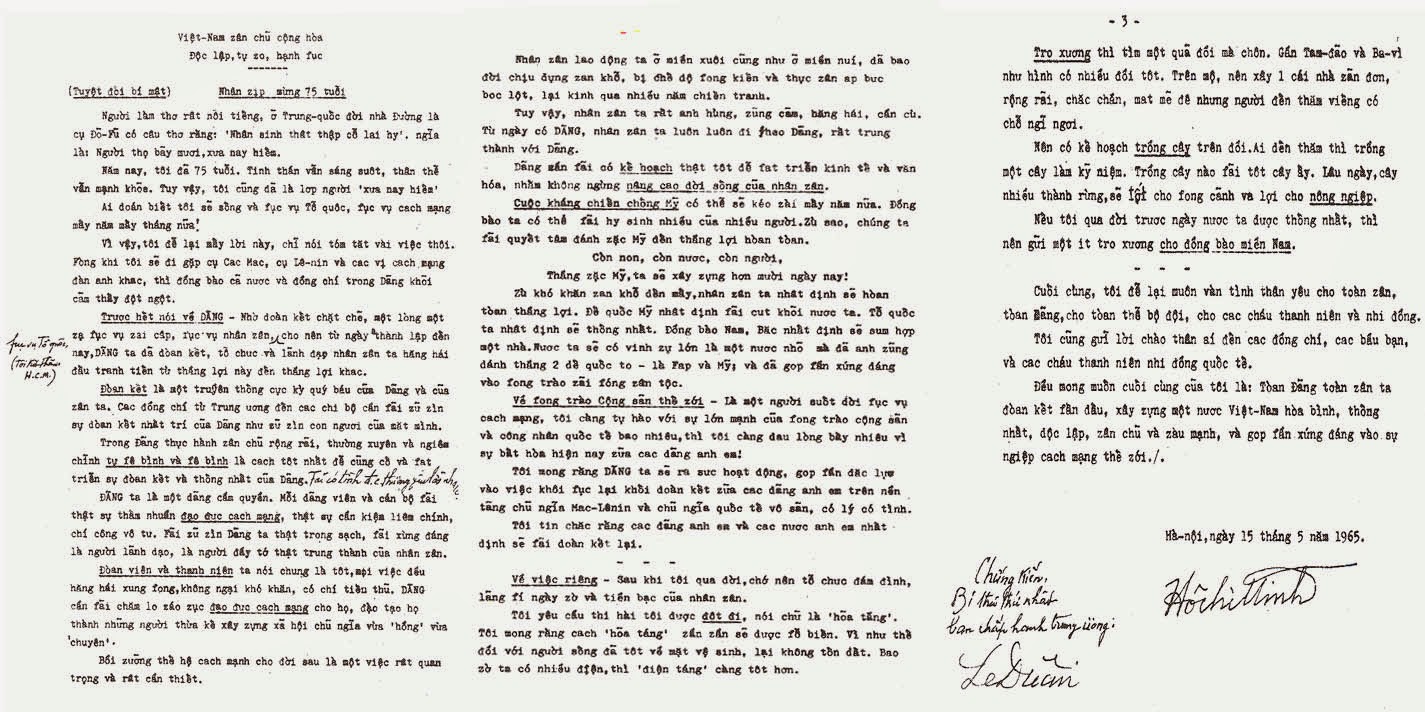 (ĐCSVN) – Năm 1965, khi tròn 75 tuổi, Bác Hồ bắt tay vào viết “Tuyệt đối bí mật” chúc. Lúc này, đồng bào và chiến sĩ cả nước đang sôi nổi thi đua lập thành tích chúc thọ Bác.