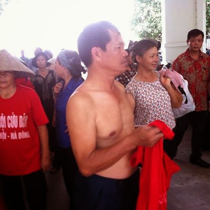 Facebook của anh Trịnh Bá Phương, một dân oan Dương Nội cho biết: Ban đầu, lực lượng bảo vệ bảo tàng bắt dân cởi những chiếc áo mang nội dung khiếu kiện mới cho vào.