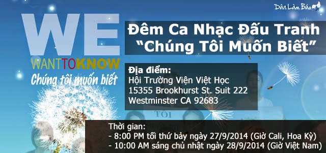 Đêm Ca Nhạc Đấu Tranh “Chúng Tôi Muốn Biết” với tiếng hát của nhiều Tù Nhân Lương Tâm trong nước và các ca sĩ hải ngoại sẽ được diễn ra vào lúc 8:00 PM tối thứ bảy ngày 27/9/2014 (Giờ Cali, Hoa Kỳ) tức 10:00 AM sáng chủ nhật ngày 28/9/2014 (Giờ Việt Nam) tại Nam Cali: