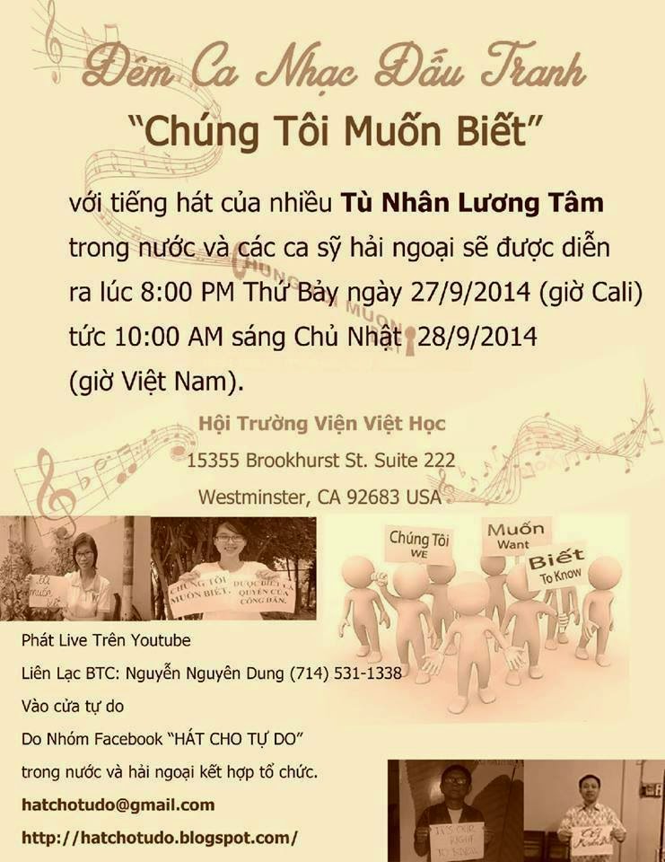 Nhóm Facebook Hát Cho Tự Do – …Đêm Ca Nhạc Đấu Tranh “Chúng Tôi Muốn Biết” với tiếng hát của nhiều Tù Nhân Lương Tâm trong nước và các ca sĩ hải ngoại sẽ được diễn ra vào lúc 8:00 PM tối thứ bảy ngày 27/9/2014 (Giờ Cali, Hoa Kỳ) tức 10:00 AM sáng chủ nhật ngày 28/9/2014 (Giờ Việt Nam) tại Nam Cali…