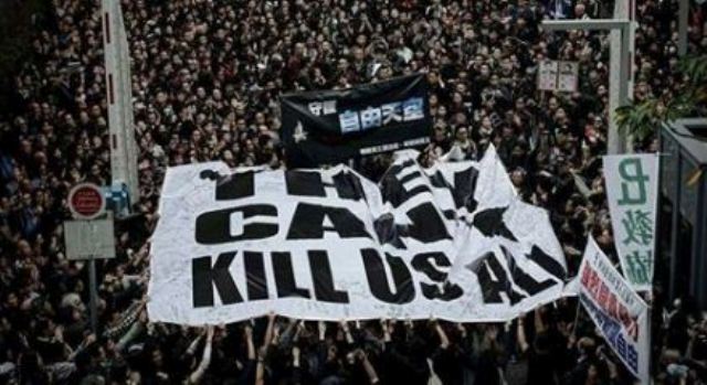 Giữa trung tâm thương mãi Hồng Kông, một khẩu hiệu thật lớn đến năm thước mỗi bề được hằng trăm bạn trẻ giương cao “They can’t kill us all” tạm dịch là “Họ không thể giết hết chúng ta”.