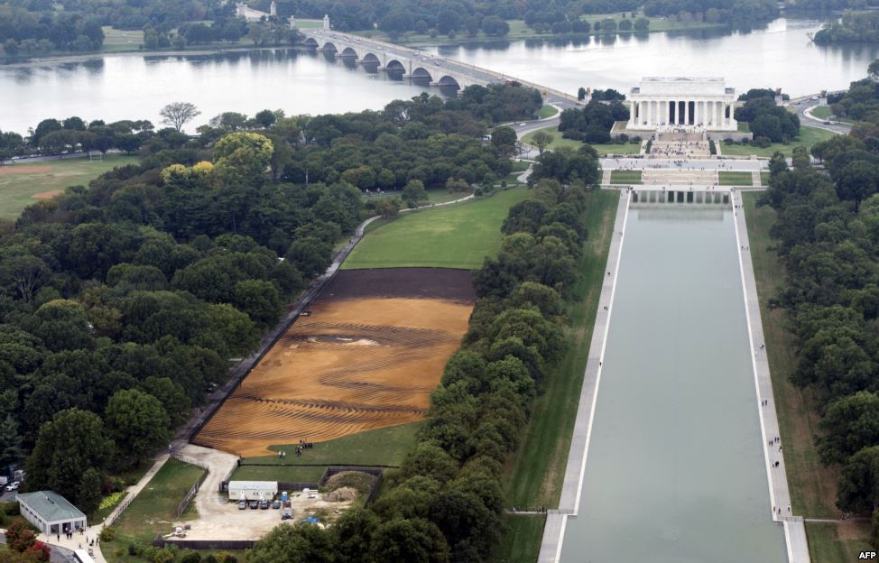 Bức chân dung khổng lồ có tên “Out of Many, One” của nghệ sĩ người Mỹ gốc Cuba Jorge Rodriguez-Gerada trên Quảng trường Quốc gia ở thủ đô Washington, ngày 1 tháng 10, 2014. Bức chân dung sử dụng khoảng 2.000 tấn cát, 800 tấn đất, 10.000 miếng gỗ, nhiều kilomét dây, cùng với sự hỗ trợ của thiết bị định vị GPS, cho phép vật liệu được sắp xếp chính xác. Tác phẩm sẽ lưu lại đây cho đến ngày 31 tháng 10.