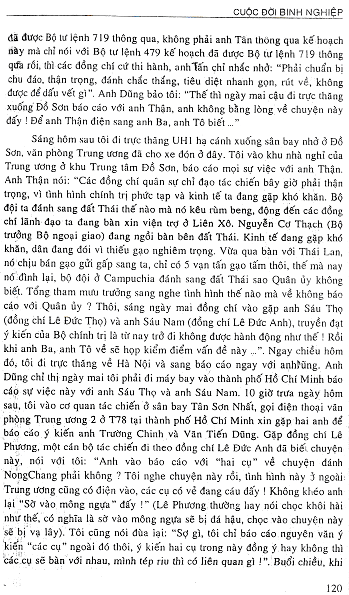 …Tôi vào phòng của đồng chí Thọ, thấy đồng chí cũng trong bộ quần áo bà ba lụa vàng, đang ngồi trên một ghế sa lông. Đồng chí chỉ tôi ngồi trước mặt, rồi đồng chí nói ngay một loạt: “Anh về báo cáo thế nào mà để các đồng chí trong Bộ Chính trị hiểu lầm nhau. Thằng già này có sợ khuyết điểm đâu, nhưng làm tham mưu, làm Cục trưởng Tác chiến phải báo cáo cho đúng sự thật, đừng che giấu khuyết điểm của mình, đừng bao che cho thủ trưởng của mình, lại đổ lỗi cho tôi tự do cho quân sang đánh trên đất Thái Lan. Chính Tổng Tham mưu trưởng, Cục trưởng Cục Tác chiến các anh sang thông qua kế hoạch, rồi về lại nói không biết…” Tôi vừa mở cặp, vừa giở sổ ghi chép lời nói của đồng chí nói với tôi ở T78 và những lời tôi báo cáo lại với đồng chí Văn Tiến Dũng nguyên văn lời đồng chí Thọ nói, chứ không báo cáo với anh Trường Chinh (vì không được gọi để báo cáo). Nhưng đồng chí Lê Đức Thọ không cho tôi báo cáo hết, mà cứ nói tiếp, tay trái vừa rút trong túi áo bà ba một tập điện đánh máy: “Đây này, điện tôi gửi ra Bộ Chính trị, anh em cơ yếu có đồng chí gửi Quân ủy Trung ương nói tình hình cụ thể, chủ trương, chủ trương đánh địch thế này! Đây này! Đây này! Sao lại nói không báo cáo, tự do chủ trương đánh sang đất Thái… Các anh Quân ủy không ai đọc, Cục trưởng Cục Tác chiến cũng không đọc à? Sao lại bảo không có báo cáo?”