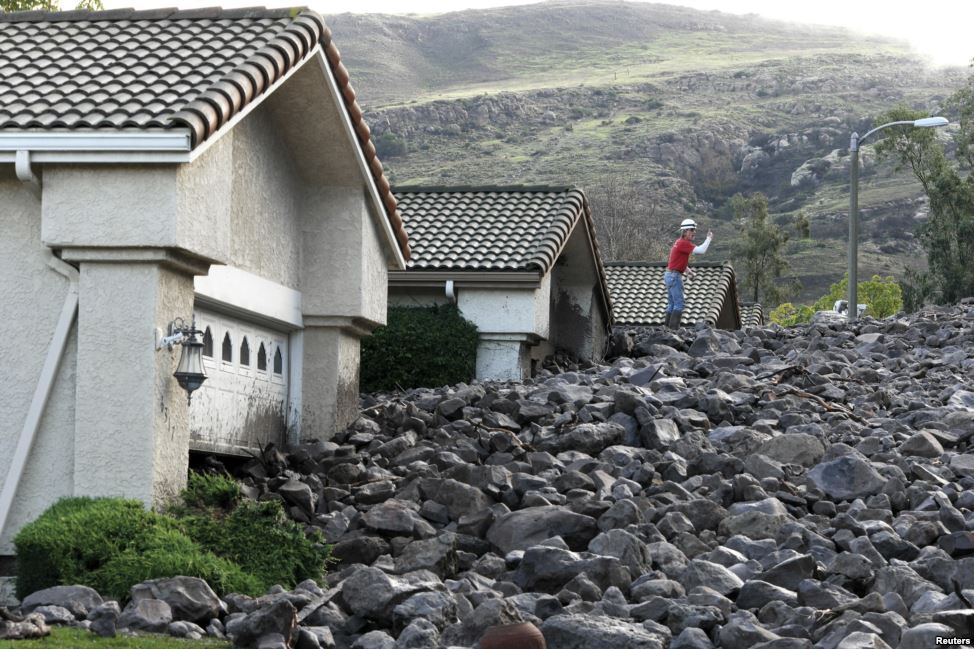 Một công nhân đứng trên một đống đá và bùn sau khi một vụ sạt lở đất ập xuống ít nhất tám căn nhà trong những cơn mưa lớn ở Camarillo Springs, bang California, Mỹ.