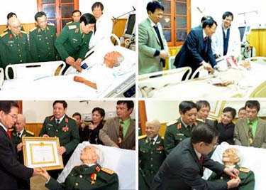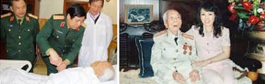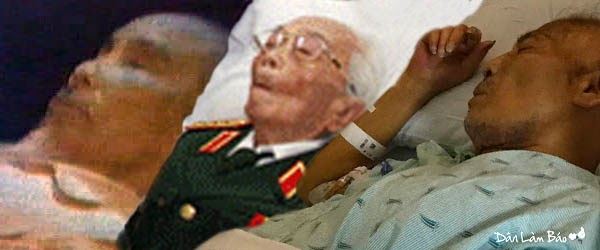 Và rồi đây này! Võ Nguyên Giáp nằm ngắc ngoải ở giường bệnh, vẫn được tướng lãnh đàn em đồng phục đại cán kéo đến hầu. Phùng Quang Thanh nắm lấy bàn tay khô héo của Võ tướng quân ra chiều luyến tiếc? Các quan chức dân sự ăn vận còm-lê đại lễ vui cười hớn hở, chắc là chúc thọ đại tướng bách niên… giai lão, trong khi đại tướng đang như xác không hồn!