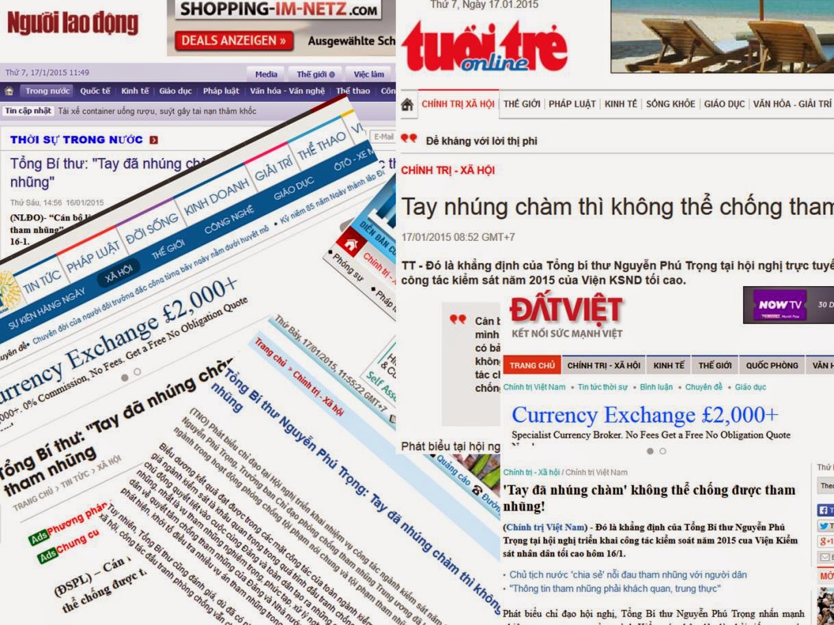 Lời phát biểu “Tay nhúng chàm thì không thể chống tham nhũng” của Tổng Bí thư, Trưởng Ban Chỉ đạo TW về phòng chống tham nhũng Nguyễn Phú Trọng được lên trang nhất của hàng loạt báo lớn như Thanh Niên, Tuổi Trẻ, Người lao động,… và ngập tràn trên các trang tin, báo điện tử những ngày qua với ngụ ý đầy bí ẩn của giới truyền thông, vốn bị bóp nghẹt bởi Ban Tuyên giáo TW trong bối cảnh 02 Ủy viên Bộ Chính trị đang bị tố cáo tham nhũng với khối tài sản lên tới hàng nghìn tỷ và hàng chục nghìn tỷ đồng, trong đó có ông Phó thủ tướng, Phó Ban Chỉ đạo TW về phòng chống tham nhũng Nguyễn Xuân Phúc.