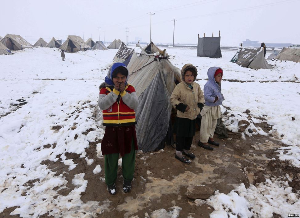 Trẻ em tản cư trong nước người Afghanistan đứng bên ngoài nơi ở của mình giữa trời lạnh trong một trại tị nạn ở ngoại ô thành phố Herat.