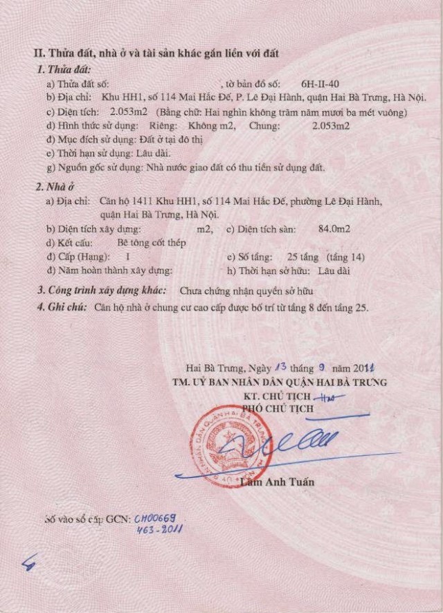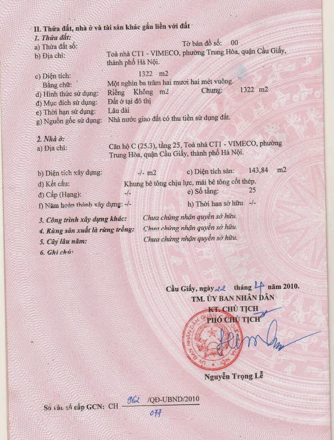 | Trích sổ đỏ căn hộ cao cấp C (25.3), tầng 25, Tòa nhà CT1-Vimeco của vợ chồng Nguyễn Tuấn Anh |