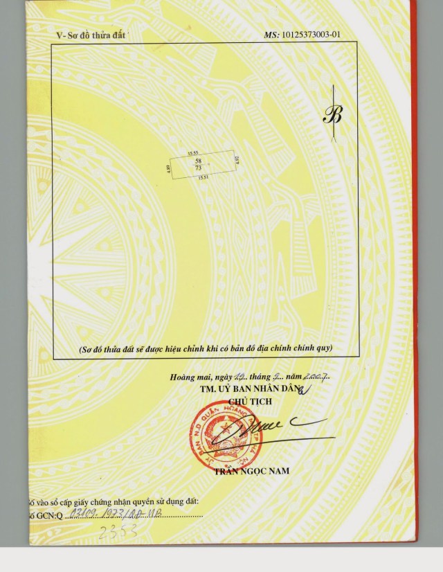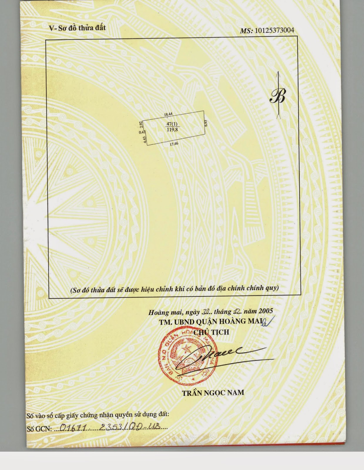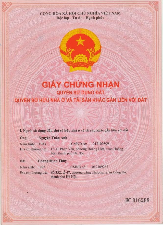 | Sổ đỏ số AD 585275 của UBND Q. Hoàng Mai cấp cho ông Nguyễn Hòa Bình năm 2005 |