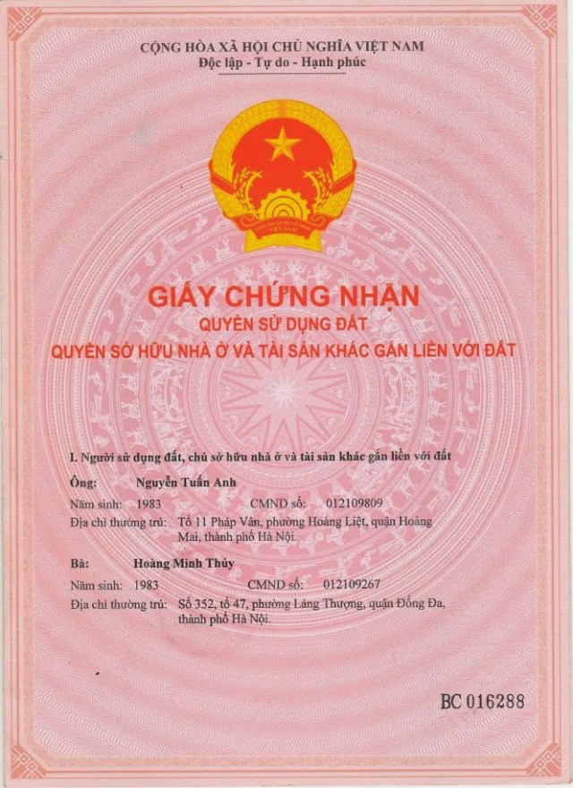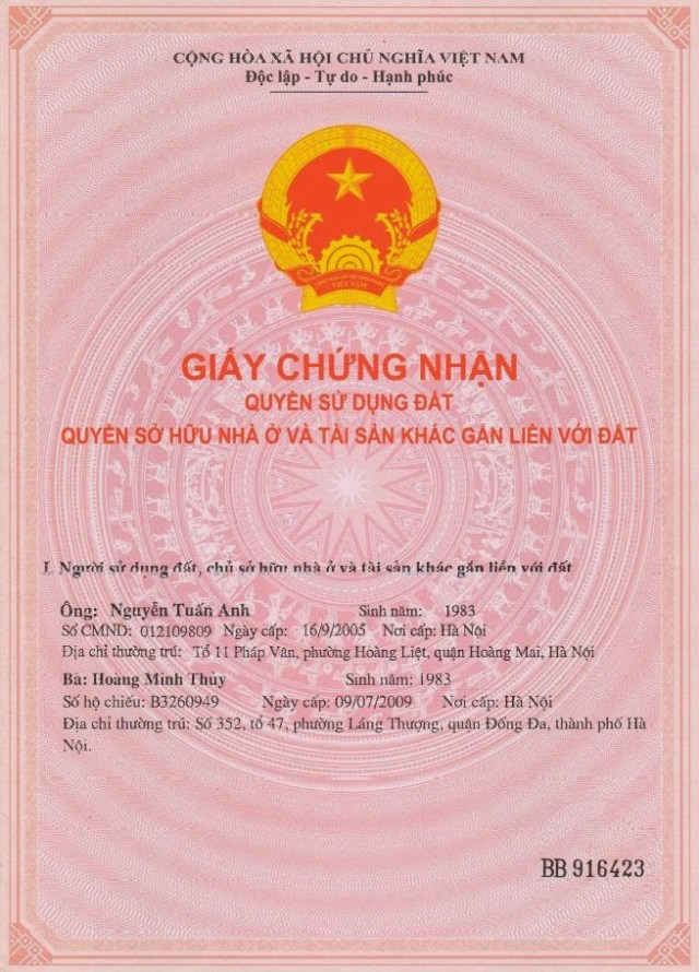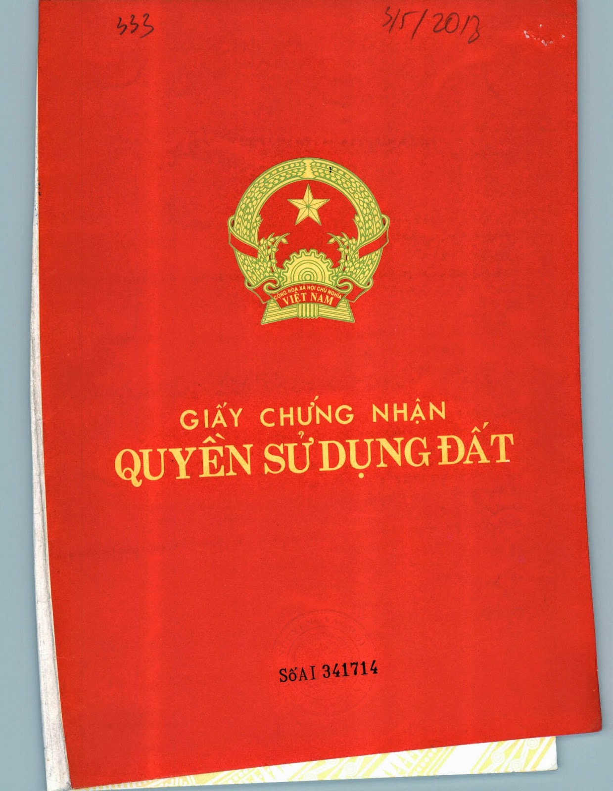 | Bìa sổ đỏ số AI 341714 của UBND Q. Hoàng Mai cấp cho ông Nguyễn Hòa Bình năm 2007 |