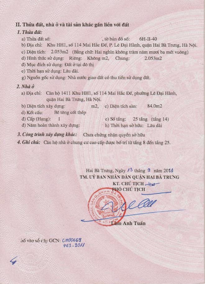| Trích sổ đỏ căn hộ 1411 tại khu căn hộ cao cấp Vincom Centre của vợ chồng Nguyễn Tuấn Anh |