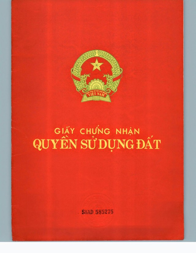 | Bìa sổ đỏ số AD 585275 của UBND Q. Hoàng Mai cấp cho ông Nguyễn Hòa Bình năm 2005 |