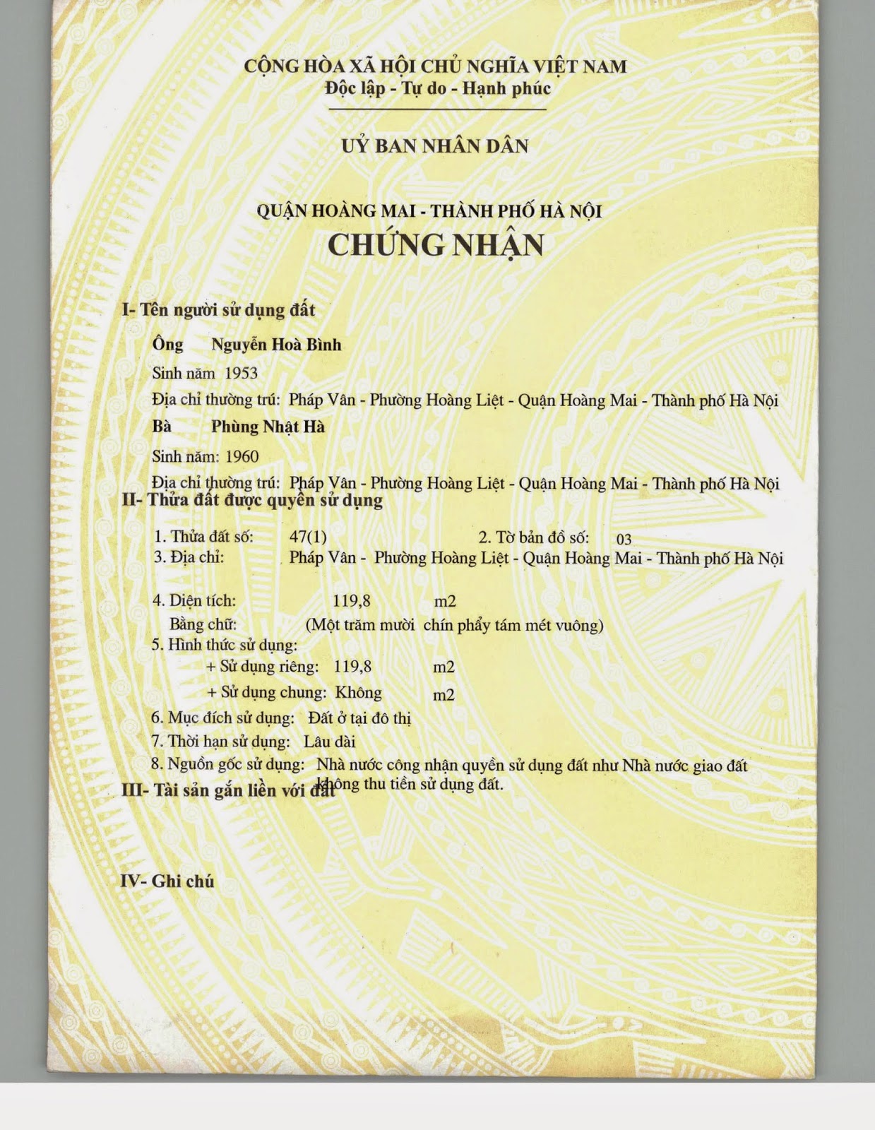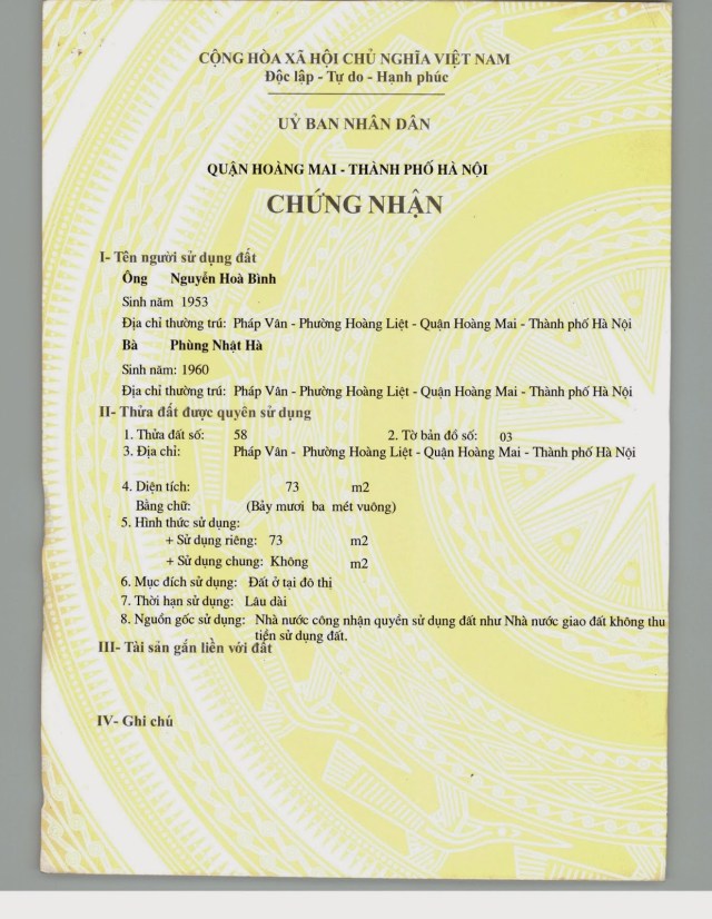 | Sổ đỏ số AI 341714 của UBND Q. Hoàng Mai cấp cho ông Nguyễn Hòa Bình năm 2007 |