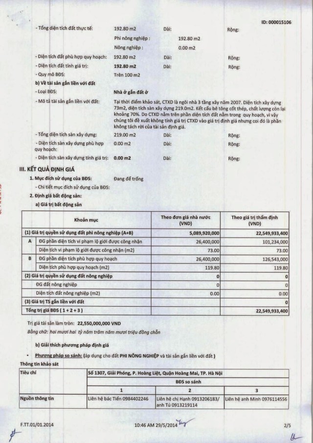 | Trích chứng thư thẩm định giá số 13.05.1743/CT ngày 24/5/2014 của Công ty Sao Mộc, mảnh đất này (không tính giá trị căn nhà vì xây dựng trái phép) có giá 22,5 tỷ đồng |