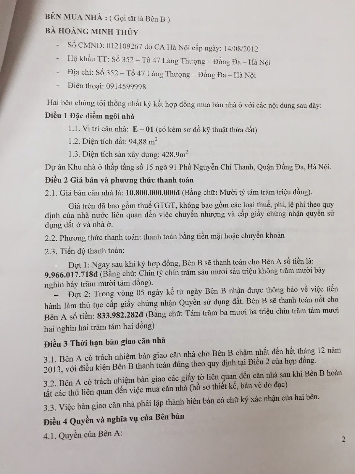 | Trích hợp đồng Hoàng Minh Thủy đứng tên mua căn E-01 với giá 10,8 tỷ đồng (trang 2) |