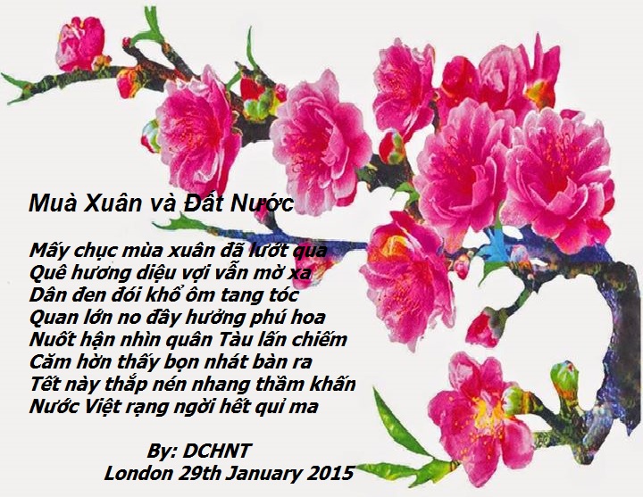 Thơ Xuân đường thi yêu nước của thi sĩ DCNT rất hay, vần thơ nghen đau lòng, và thơ của thi sĩ B cũng làm xuac động hồn thơ viễn xứ khi nghĩ đến Việt Nam còn hay đã mất???