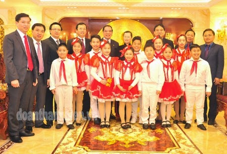 Phía trước mặt bức tượng Hồ Chí Minh dát vàng, có thể dễ dàng nhận ra cựu tổng bí thư Nông Đức Mạnh đang cười toe toét bên cạnh người vợ mới của mình là bà Đỗ Thị Huyền Tâm.