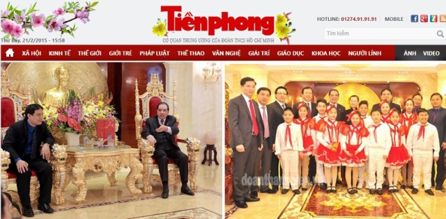 Bức ảnh ngai vàng đầu rồng được báo Tiền Phong thay bằng hình ảnh đoàn khách viếng thăm đứng bên cạnh người vợ mới cưới của cựu TBT Nông Đức Mạnh – tức ‘Mạnh Vương’Bạn đọc Danlambao – Báo Tiền Phong – cơ quan ngôn luận của đoàn thanh niên cộng sản Hồ Chí Minh vừa phải tháo gỡ những bức ảnh về nội thất xa hoa, kệch cỡm trong tư dinh của cựu tổng bí thư Nông Đức Mạnh.