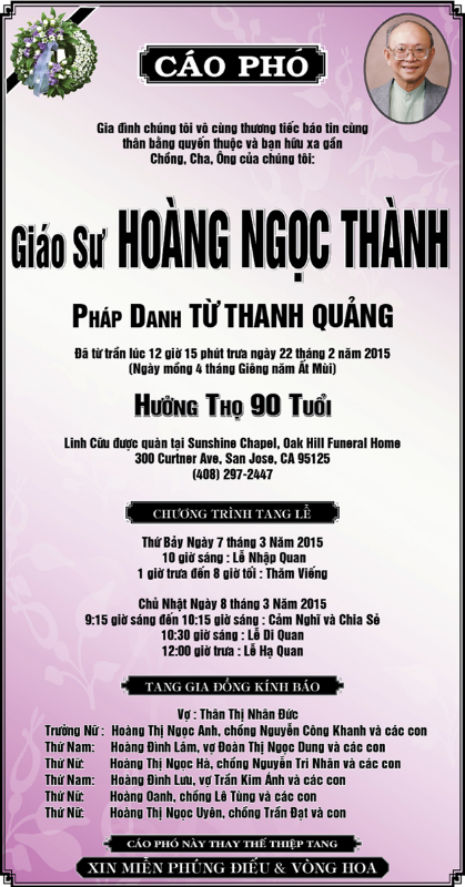 Cáo Phó giáo sư Hoàng Ngọc Thành đã qua đời.