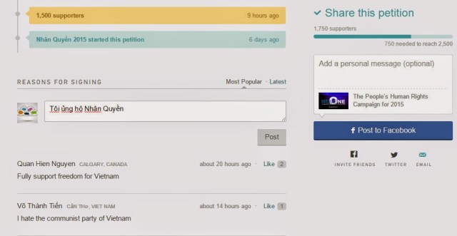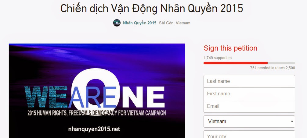 Qua bài hướng dẫn trên, hy vọng các bạn có thể dễ dàng tham gia ký tên cho mình và cho những người thân. Chúc cho Chiến Dịch Tranh Đấu cho Tự Do – Dân Chủ – Nhân Quyền 2015 sớm thành công với mục tiêu 100 ngàn chữ ký.